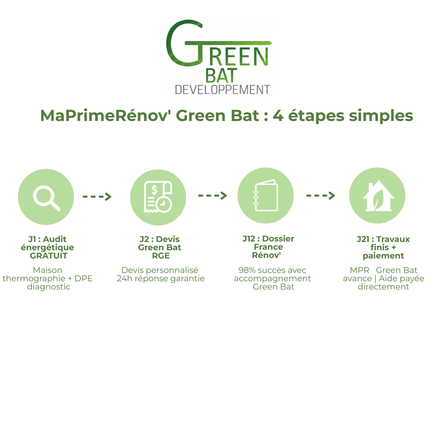 12 jours avec Green Bat (98% succès vs 45j sans accompagnement).